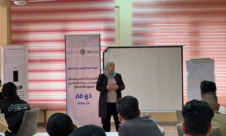 Tammuz Organization for Social Development conducted a Training of Trainers (ToT) for a group of teachers on the use of an educational escape game as an innovative tool to raise awareness about the risks of irregular migration. The training was implemented in cooperation with Ministry of Migration and Displacement within the framework of the Raising Awareness of the Risks of Irregular Migration in Iraq (RADIM) project, funded by UK International Development and implemented in partnership with Seefar, on Saturday, 7 March 2026 in Dhi Qar Governorate.
